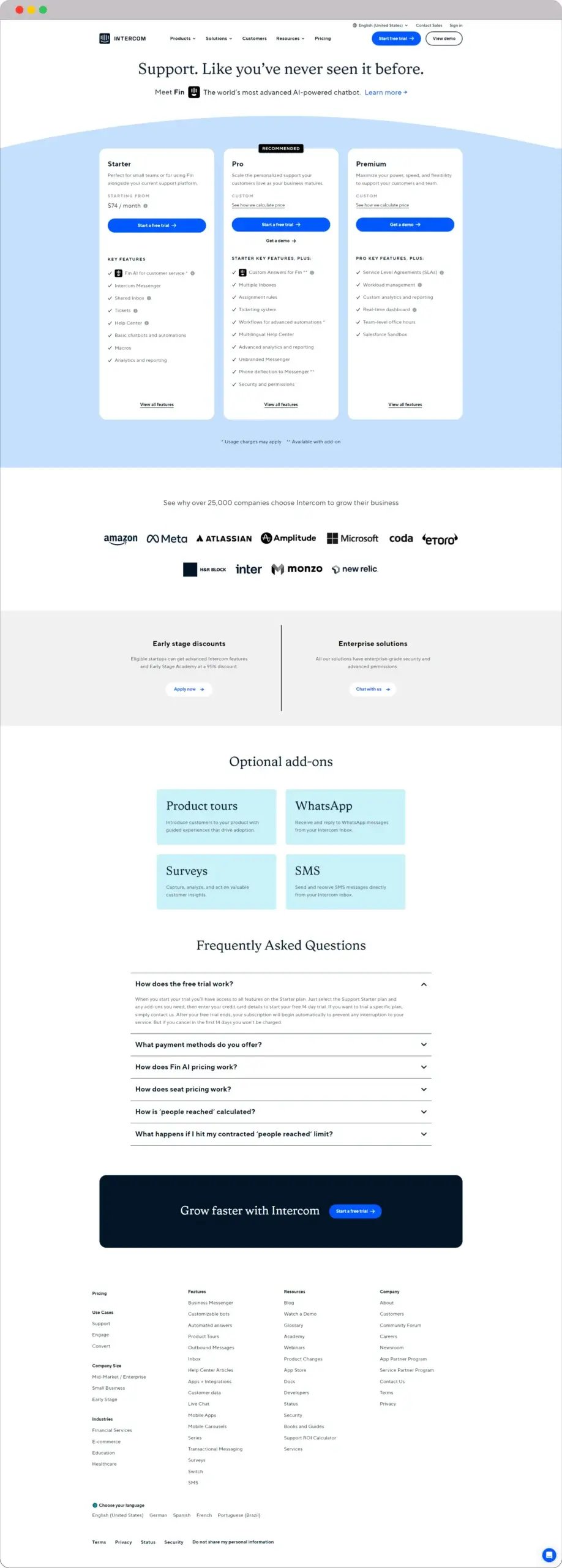 There isn’t much to elaborate on here. The page straightforwardly presents all the pricing plans and a comprehensive breakdown of included features. Towards the end, the page allows users to find answers to their queries through FAQs.