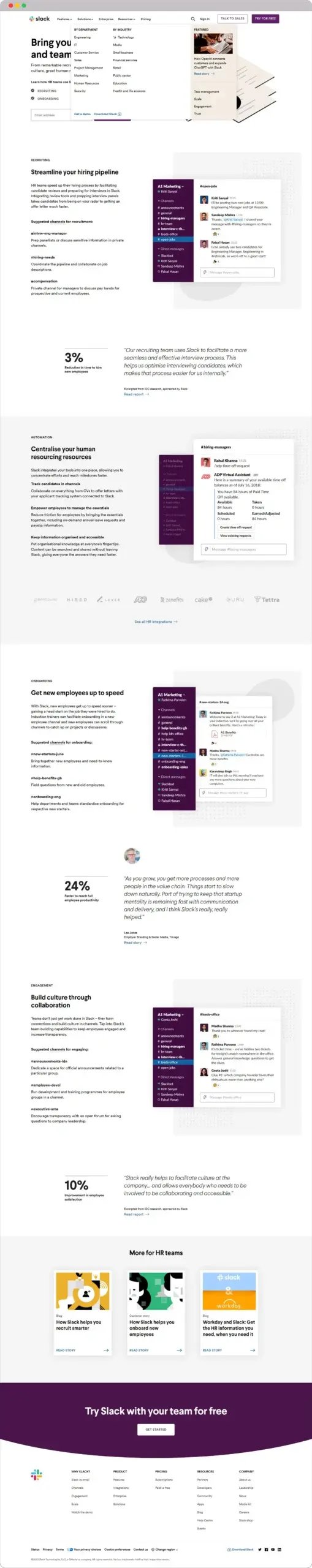 Following the popular SaaS web design trend, Slack employs the design elements in alternating arrangements of text and images to illustrate its main features.