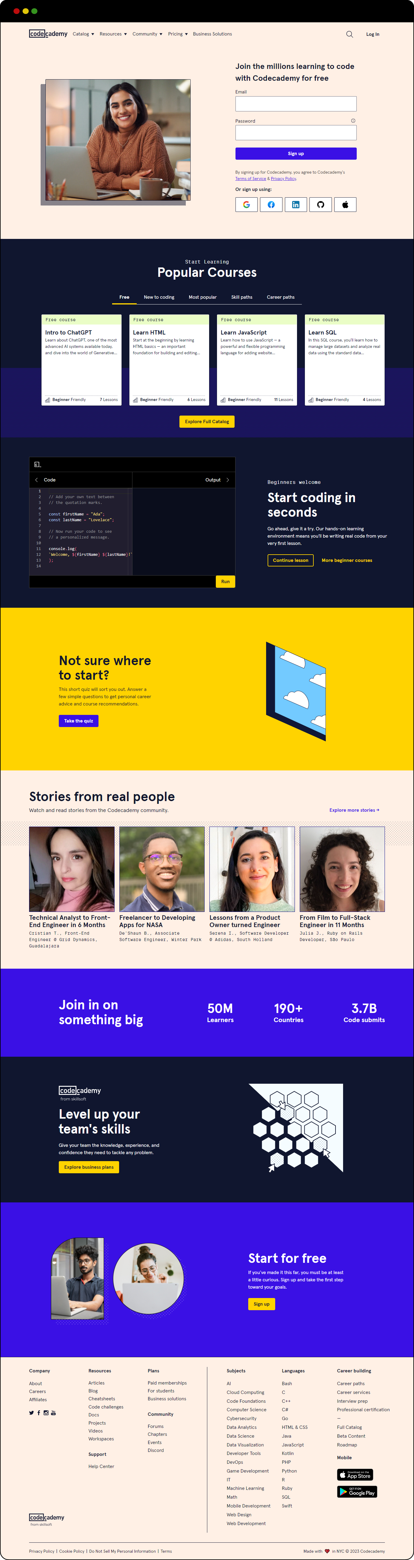 Overall, the Codecademy sales landing page is well-designed, with a clear message, persuasive copy, and eye-catching graphics.