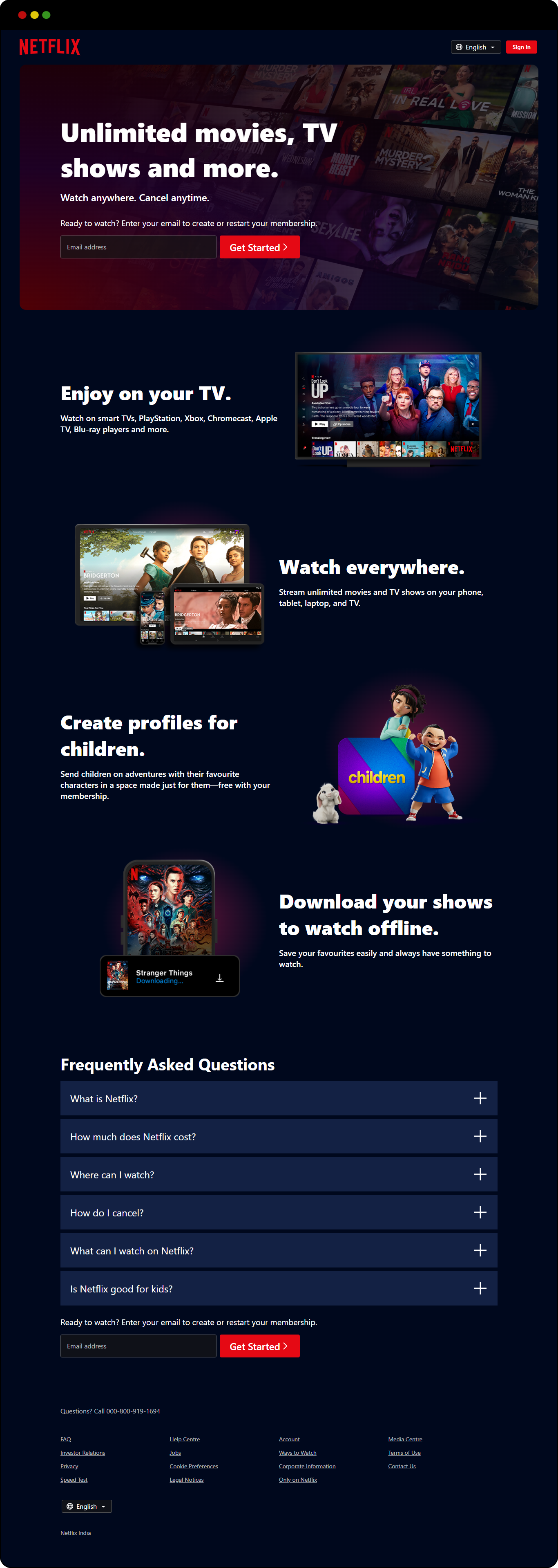 - Netflix’s landing page effectively communicates the value of its product. They showcase a wide variety of popular and critically acclaimed titles.