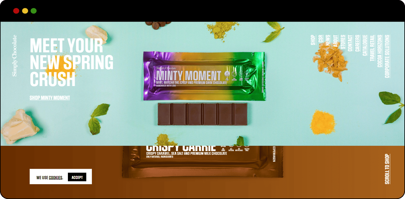 - Simply Chocolate’s call-to-action is clear and compelling for people to convert. They use urgency to motivate visitors to take action, with a bold “Shop Now” button prominently displayed throughout the page.