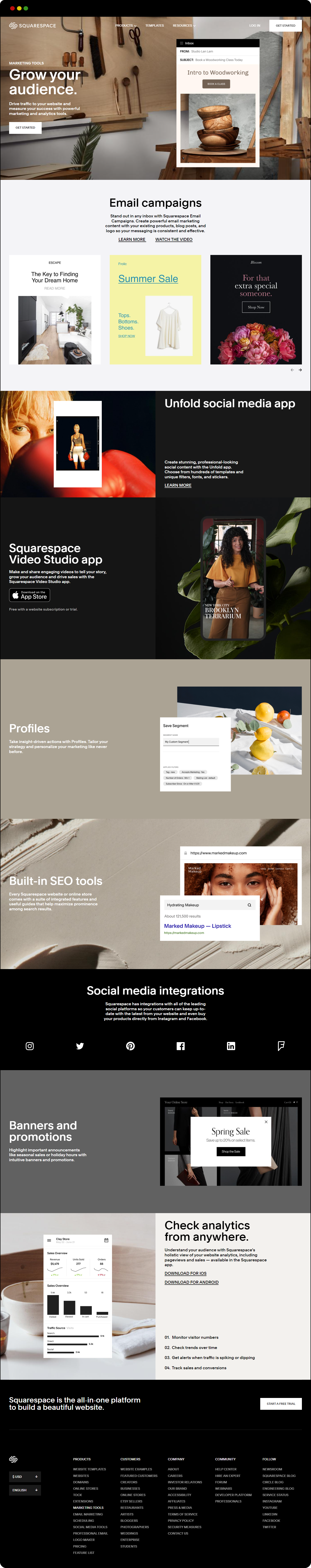 - Squarespace’s sales page does an excellent job showcasing its platform’s value. They highlight features like customizable templates, built-in SEO tools, and 24/7 customer support.