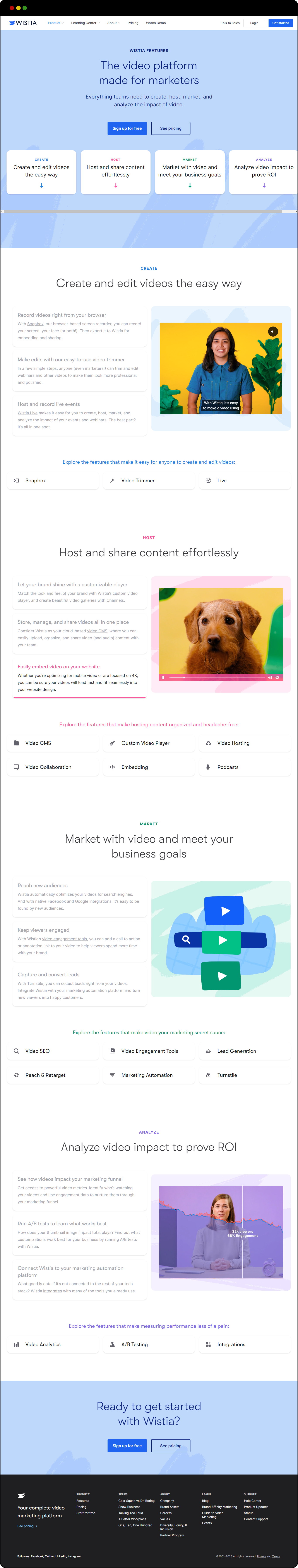 - Wistia’s sales page is designed with the user in mind. The layout is easy to navigate, with clear calls to action that guide visitors toward the desired outcome.