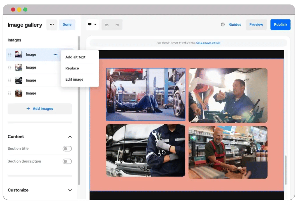 While the default design might seem limited, it’s far from dull. You can still personalize it to an extent, with options to change fonts, colors, backgrounds, element styles, and photo layouts, giving you enough flexibility to create an appealing and professional-looking site. On paid plans, you can upload your own logo, customize the header, and replace the default footer with your branding.