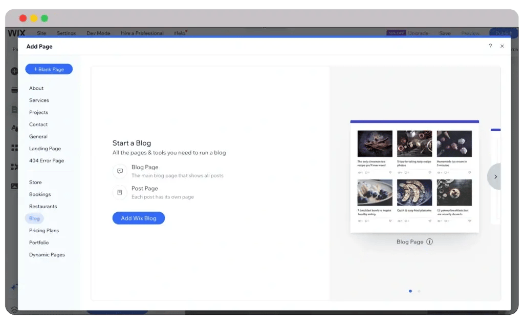 Wix: Dedicated blogging page