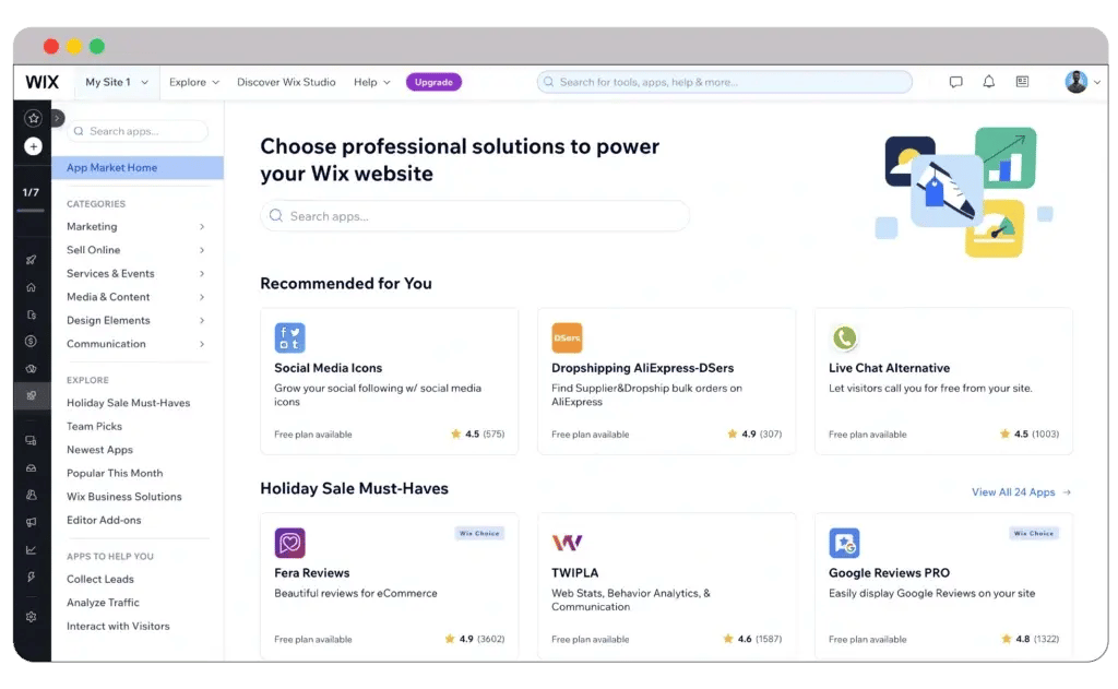 Wix also features a robust marketplace, the Wix App Market, where users can browse various add-ons organized into six main categories. These include apps developed by both Wix and third-party providers, enabling you to easily add extra functionality and customization to your website.