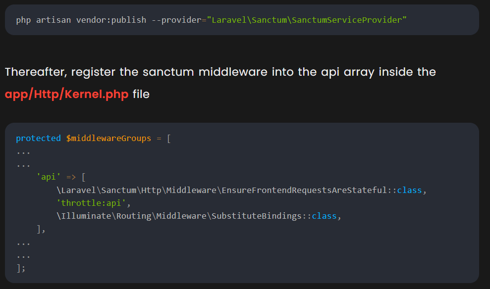 So to install the package, you have to follow the command as per given in laravel documentation . As I am going to use Sanctum, I will use this command :