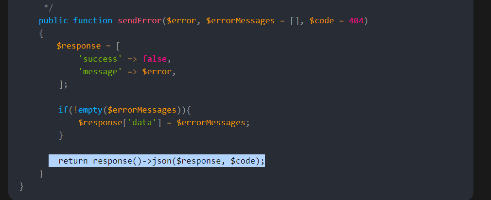 return $this->sendError(‘Unauthorised.’, [‘error’=>’Unauthorised’]);